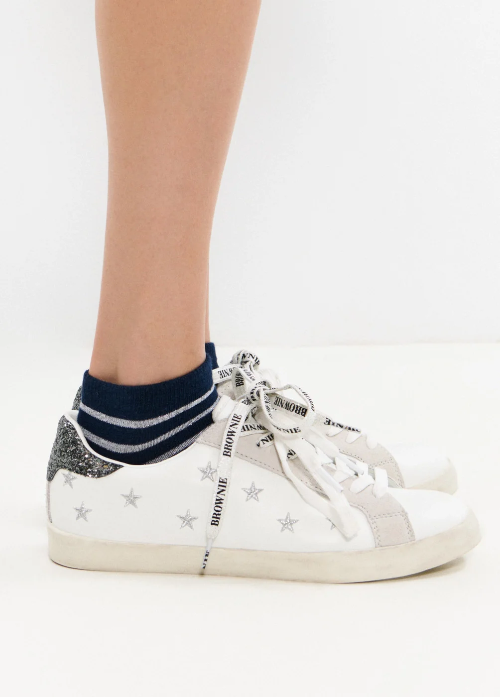 Bamba con detalle de estrellas plateadas y contraste de cordones.