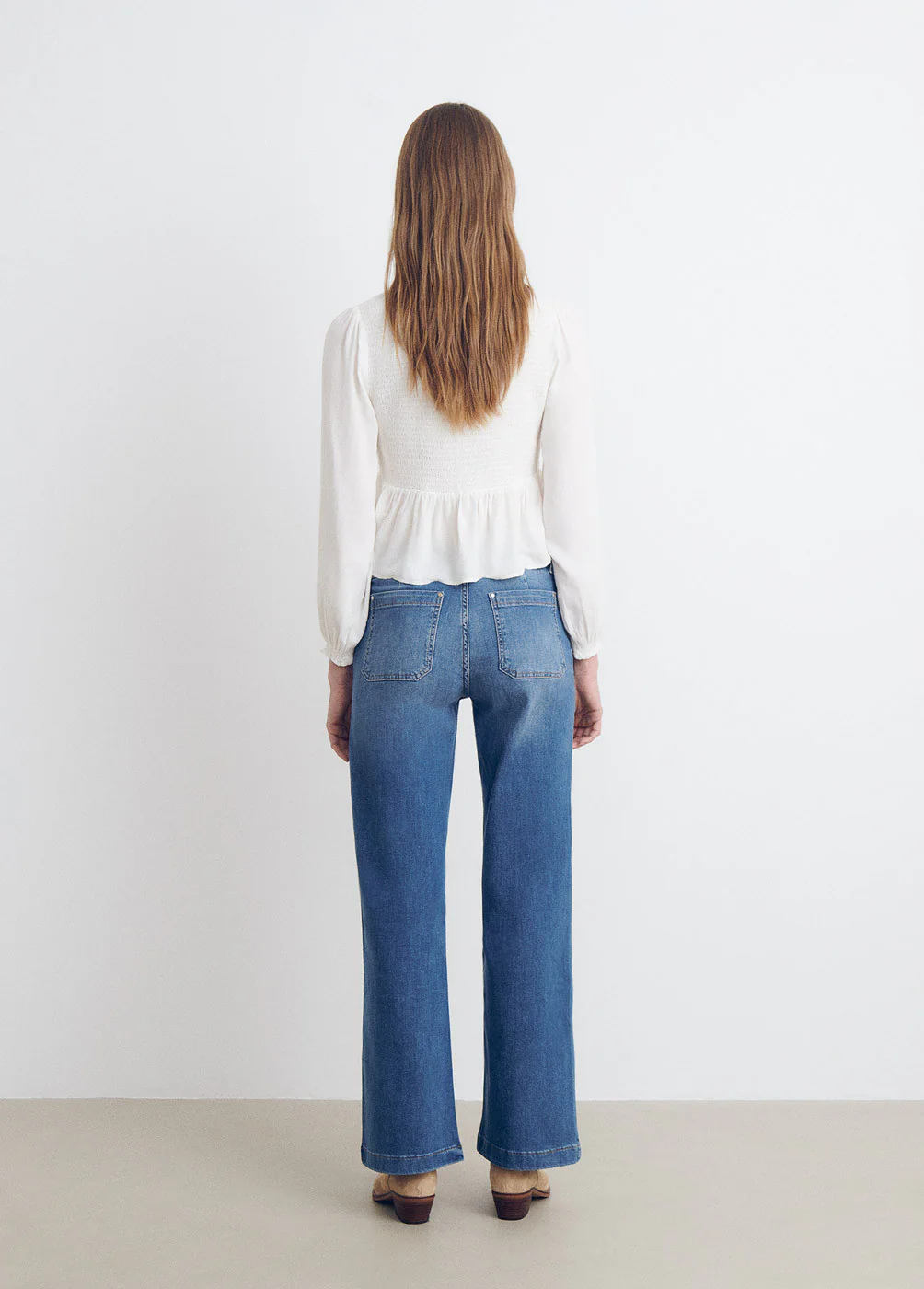 Blusa lisa de manga larga abullonada, cuello redondo, smock y botones en la parte frontal.