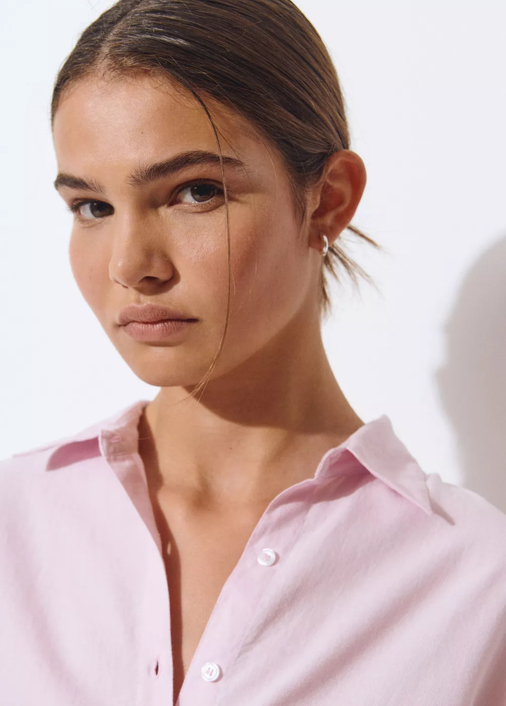 Camisa básica lisa de manga larga, cuello con solapas y cierre mediante botones en el frontal.