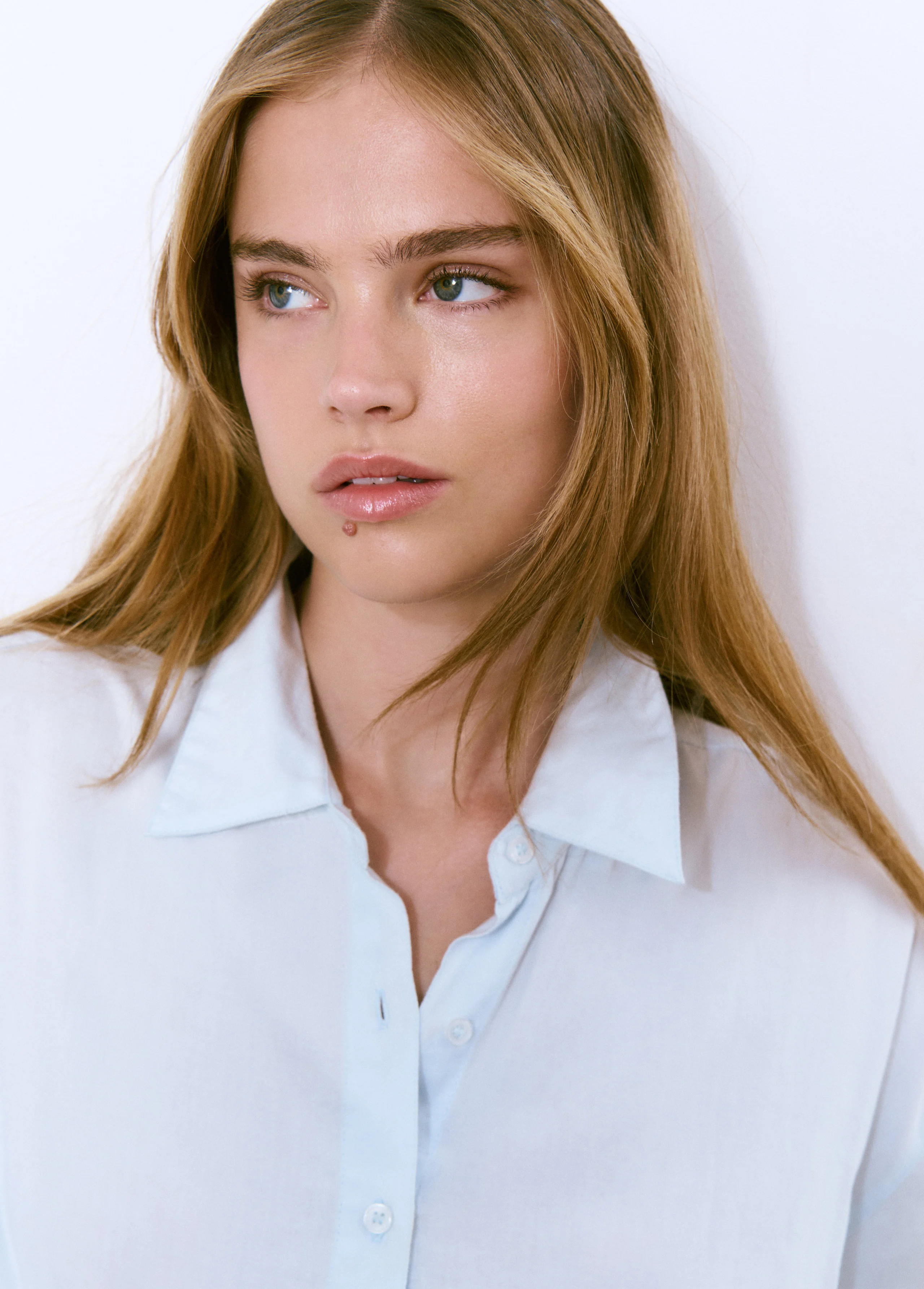 Camisa básica lisa de manga larga, cuello con solapas y cierre mediante botones en el frontal.
