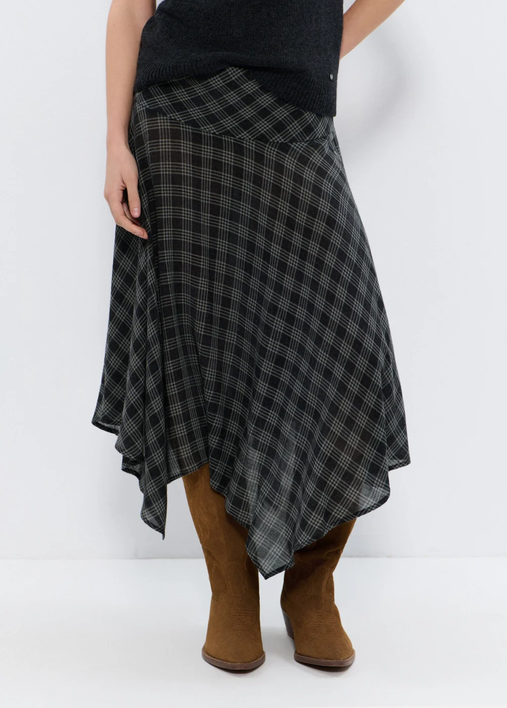 Falda midi asimétrica de cuadros.