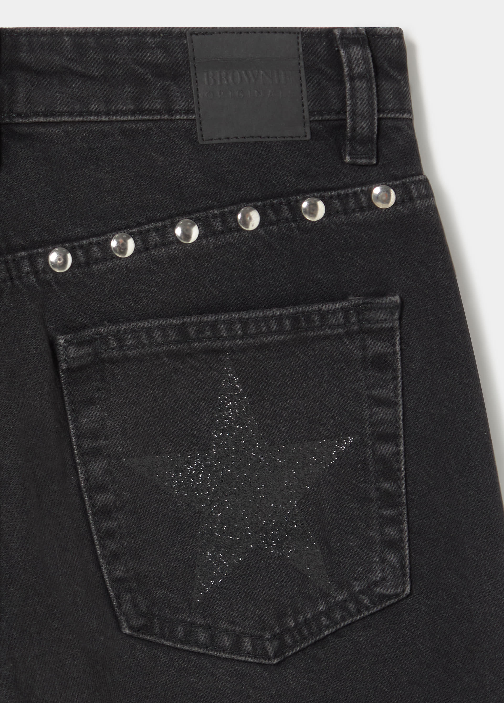 Vaqueros rectos con tachas en los bolsillos y los laterales, y estrellas en los bolsillos traseros.