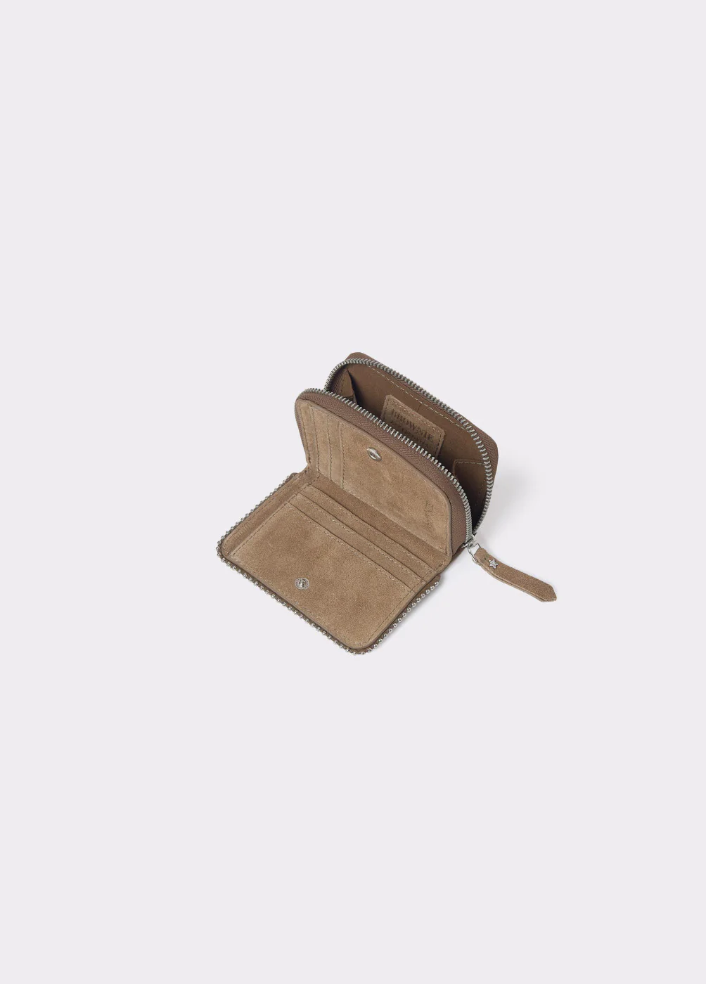Monedero de piel en color taupe oscuro con bolitas.