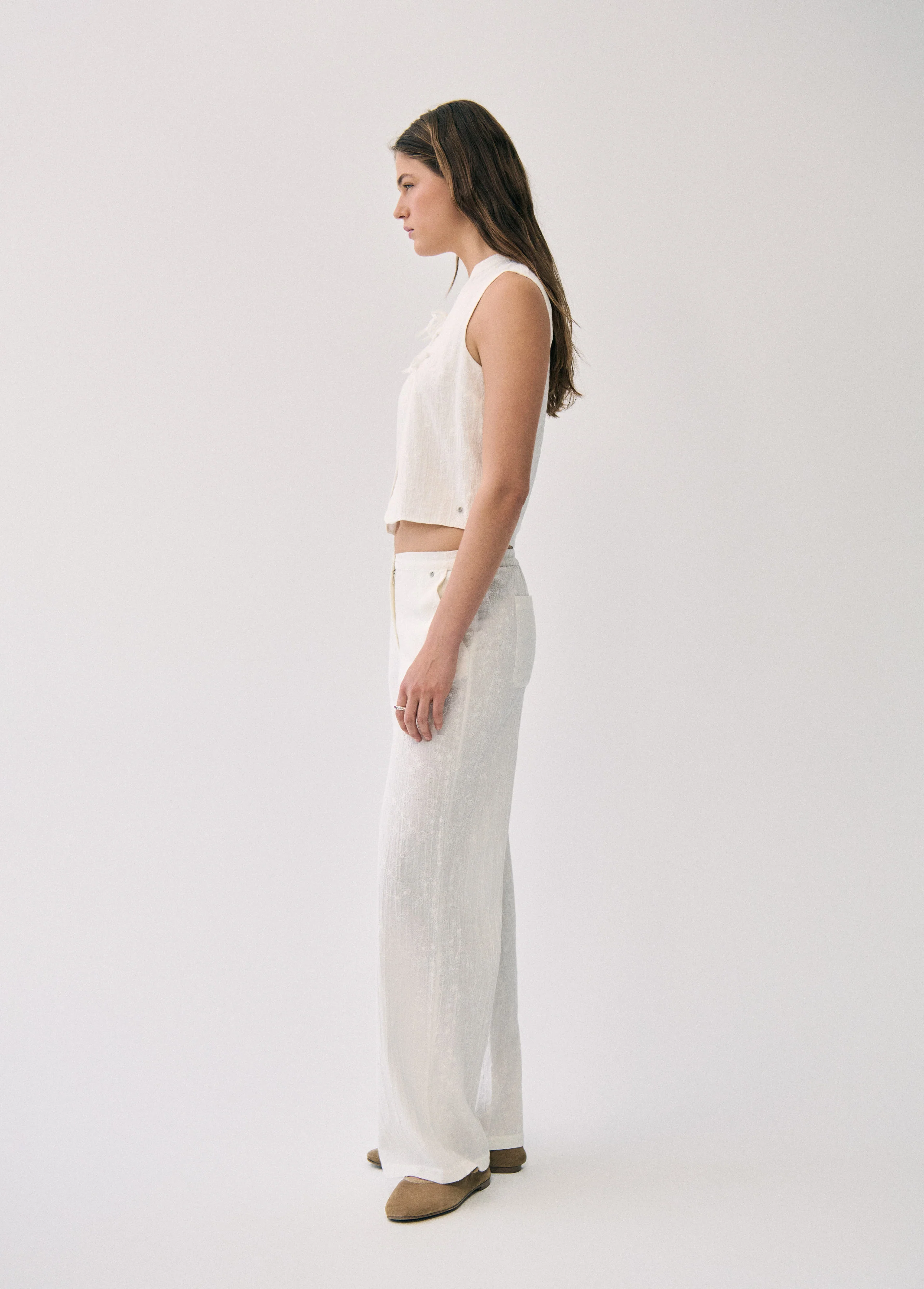 Pantalón recto bordados con goma en la cintura y cierre mediante botón.