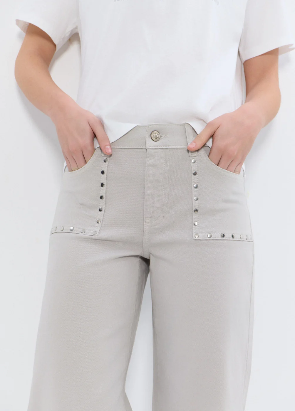 Pantalón recto con detalle de tachas en los bolsillos.