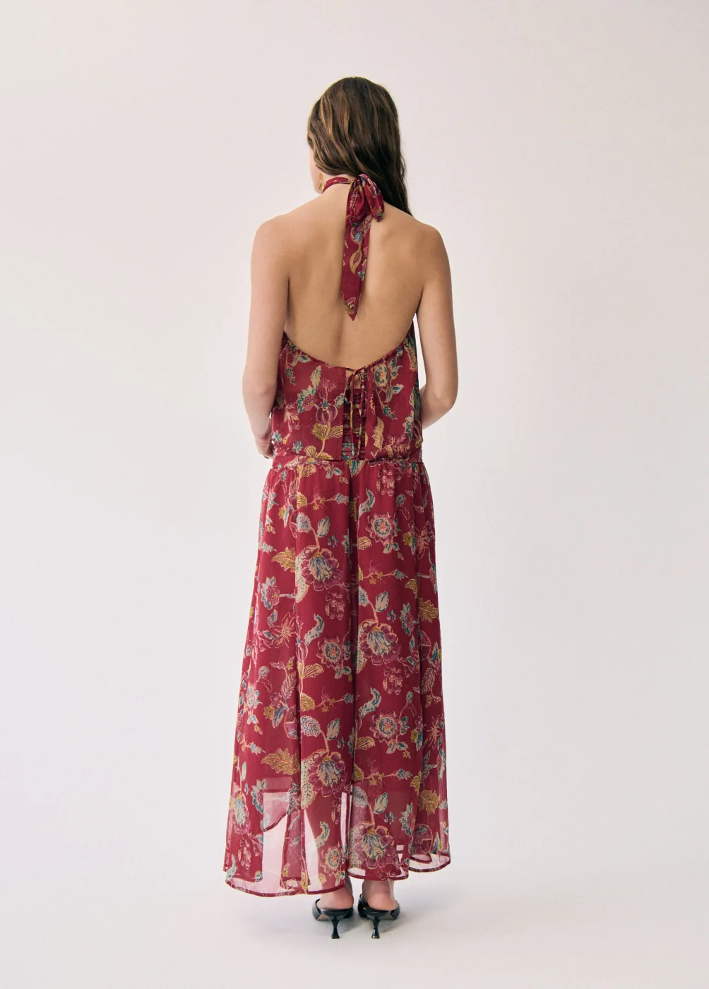 Top sin mangas con choker y estampado de flores.